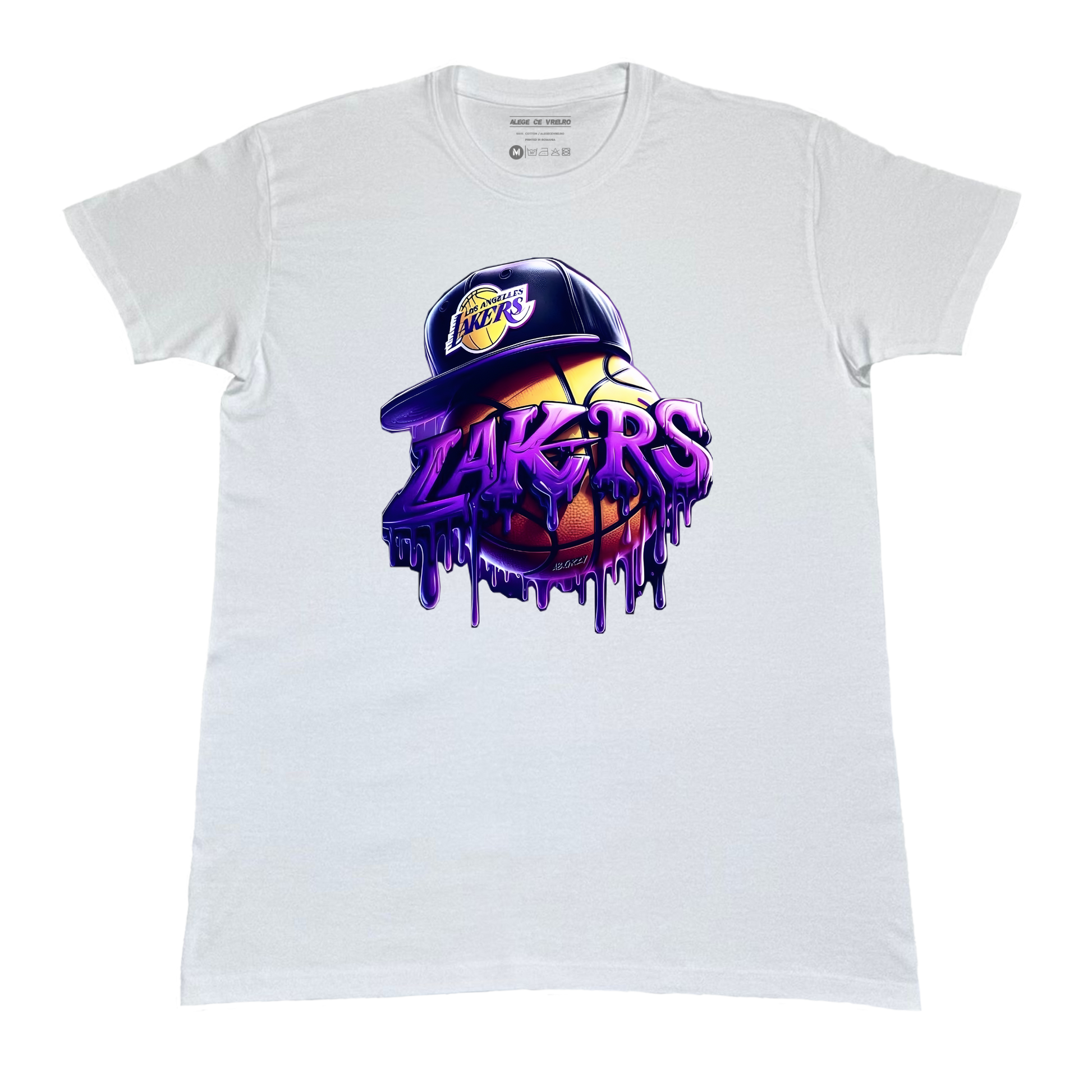 Un tricou modern, cu un design grafic spectaculos dedicat fanilor baschetului și ai culturii streetwear. În prim-plan, o minge de baschet poartă o șapcă cu logo-ul Los Angeles Lakers, în timp ce literele „LAKERS” apar într-un stil graffiti mov, cu efect dripping. O piesă vibrantă, care îmbină spiritul sportiv cu atitudinea urbană și energia fan culture.